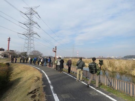 下見(10日)と違って、風が殆どなく、薄日が差す探鳥日和の例会となった。 初参加者4名を含む39名、車10台に分乗して出発した。 最初の第二機場に着いて、カワセミを見つけ楽しんでいるとすぐ上空を偶然に大型の鳥の編隊飛翔がありカメラにて確認するとなんとオオハクチョウ7羽とシジュウカラガン1羽という吉兆に恵まれた。 遊歩道をオオジュリン、ホオジロ、アオジなどを探鳥しながらヒドリ橋へ向かう。先着ドライバー達と合流すると、まず沼上を舞うミサゴが目に入った。冬季にも拘わらず繁茂しているナガエツルノゲイトウの中州でバン、大津川を鳴きながら横切るクイナに出会う。日当たりは少し暑い程になった。 道の駅はリニューアルオープン(16日)直前で素通り、且つ下見時認めたマガンを探す時間を確保するためハス田も割愛し染入落へ直行した。 微風のためカモ達は、風除けせず湖面中央近くに点在していてくれた。主にマガモ、カルガモでしたがその群れの中にヒドリガモが混ざり、ミコアイサの小群も見えた。お目当てのマガンを必死に探すが今日は居ないようだ。中央部のカンムリカイツブリの小群を横目にトモエガモを探す。居た!マガモの群れの端にゆっくりと落ち着いた姿を見せてくれた。 結果的に、カモ科15種が認められ時間配分を下沼重点にした成果といえる。 第二機場での吉兆は正しく、合計53種(昨年12月は48種)を認めることができた。 報告 松本勝英 |