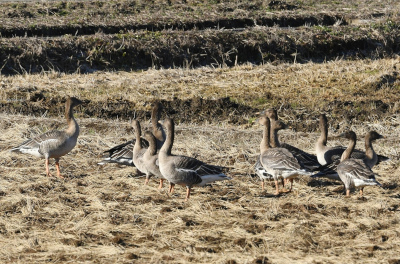 新年初の探鳥会。参加者13名は車4台に分乗して我孫子駅北口を8時に出発しました。途中2台が道を間違えるハプニングがありましたが、トイレ休憩場所の稲敷市役所で無事合流して江戸崎地区の稲波干拓に向かいました。 江戸崎では「稲敷雁の郷友の会」の観察小屋の堤防脇からオオヒシクイを観察しました。この日の飛来数11羽で、昨年の探鳥会の飛来数50羽より少ない数でしたが、11羽とも観察小屋近くの田に集まっていたため近くから観察することができました。そのため車の乗り降りの際のドアの開閉音にも気を付けるなどオオヒシクイとの距離が近いことを実感しました。近くの田ではハシボソガラスの群れに数羽のミヤマガラス、杭にとまるノスリ、電柱にチョウゲンボウが見られました。小野川にはたくさんのオナガガモ、上空にはミサゴがいて川に飛び込み魚を捕る迫力ある瞬間も見られました。次は西ノ洲へ行き、タゲリやタシギなどを観察しました。順光だったのでタゲリの羽がいろいろな色に輝くのがよく観察できました。 その次は和田岬の和田公園で探鳥。公園ではタヒバリ、ビンズイ、キクイタダキ等が見られました。霞ヶ浦ではホシハジロ、ヒドリガモが見られました。公園内で昼食を済ませた後、また公園内を歩きシメなどを観察しました。 次はトイレ休憩のため妙岐の鼻へ。ここで突然チュウヒが現れたので短時間だけ観察して、レンコン街道へ進み蓮田で探鳥。蓮田ではムナグロ、ハマシギの群れ、セイタカシギ、ハシビロガモなどが見られました。 その後、レンコン街道に戻り、鉄塔下へ向かいました。ここの蓮田ではこの日まだ観察できていないタカブシギ、コチドリなどを期待しましたが残念ながら見ることはできませんでした。 最後は甘田地区を回りながら帰路へ。「直売所しもふさ」で鳥合わせをして、解散しました。 探鳥会2日前に雪が降り道路の凍結なども心配されましたが、当日は晴天で風も無く探鳥日和でした。何よりオオヒシクイをはじめ、どの鳥も比較的近くで観察できた好条件の日でした。 鳥合わせの結果68種を確認しました。 報告 片田 寛子 |